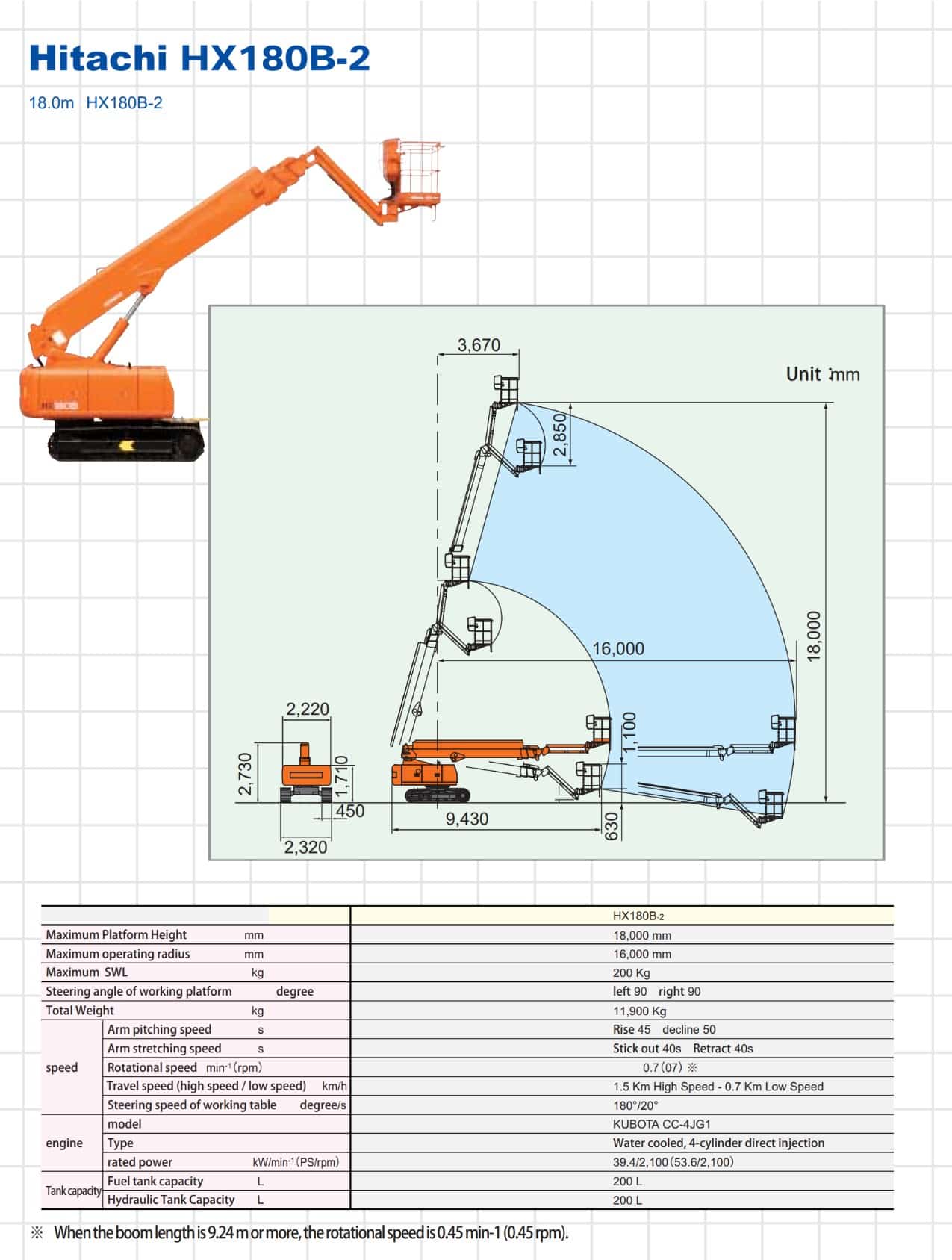 The Hitachi HX180B (HX180B-2) is a robust tracked boom lift with significant working height (18 m) and reach (16 m), decent platform capacity (200 kg), and a stable crawler undercarriage for terrain versatility. It suits elevated-work tasks on construction, maintenance or industrial sites, especially where wheeled machines may struggle.